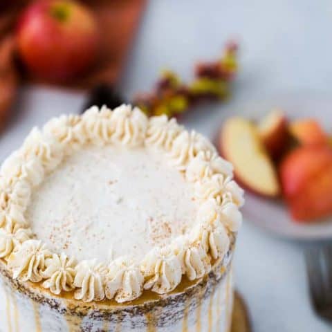 A warm and spiced Apple Spice Cake is topped with a whipped cinnamon frosting and drizzle of caramel for this fall-tacular cake!