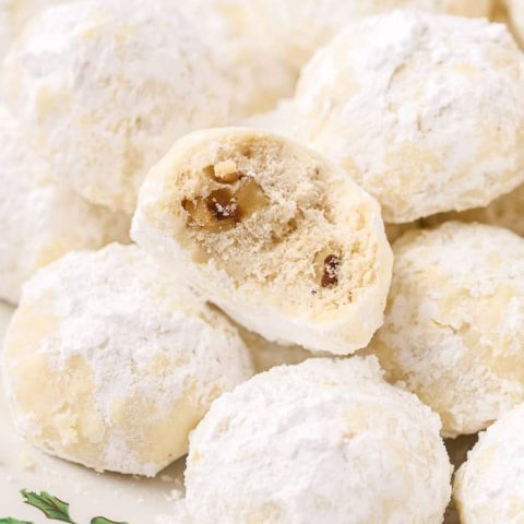 These snowball cookies go by many names but they're always quick to disappear from the cookie tray! They are a buttery cookie filled with walnut pieces and rolled in powdered sugar.