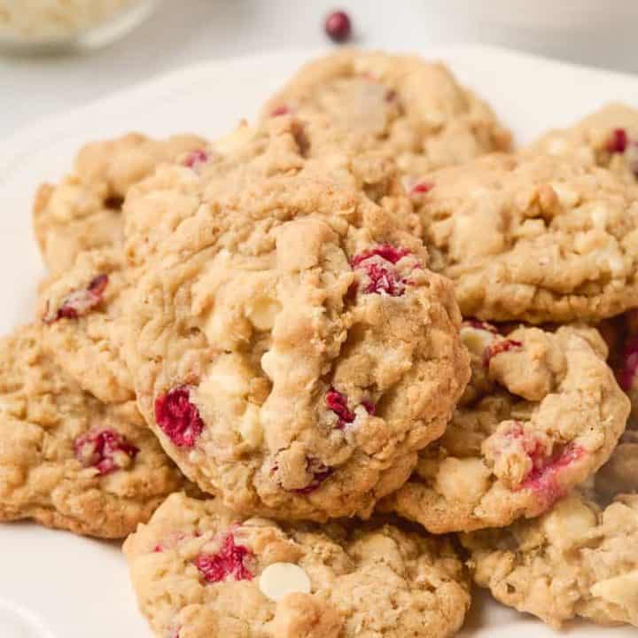 A soft, chewy, oatmeal cookie that is packed with festive flavor. These cookies are made with fresh cranberries and white chocolate chips.